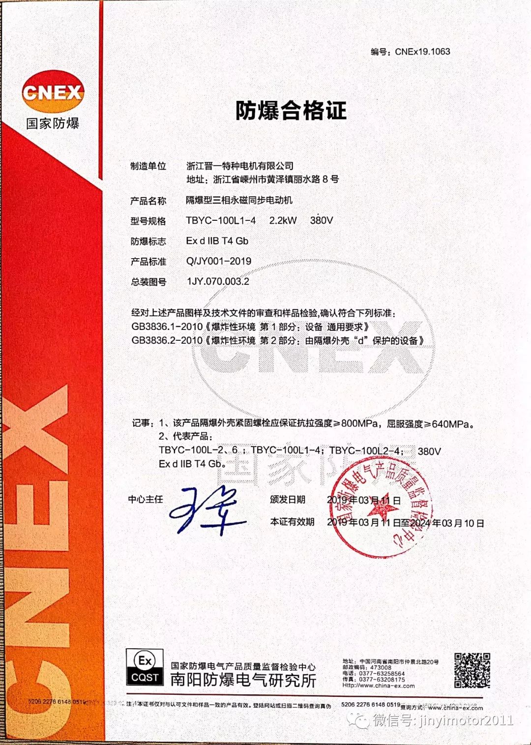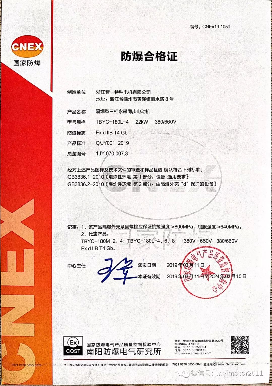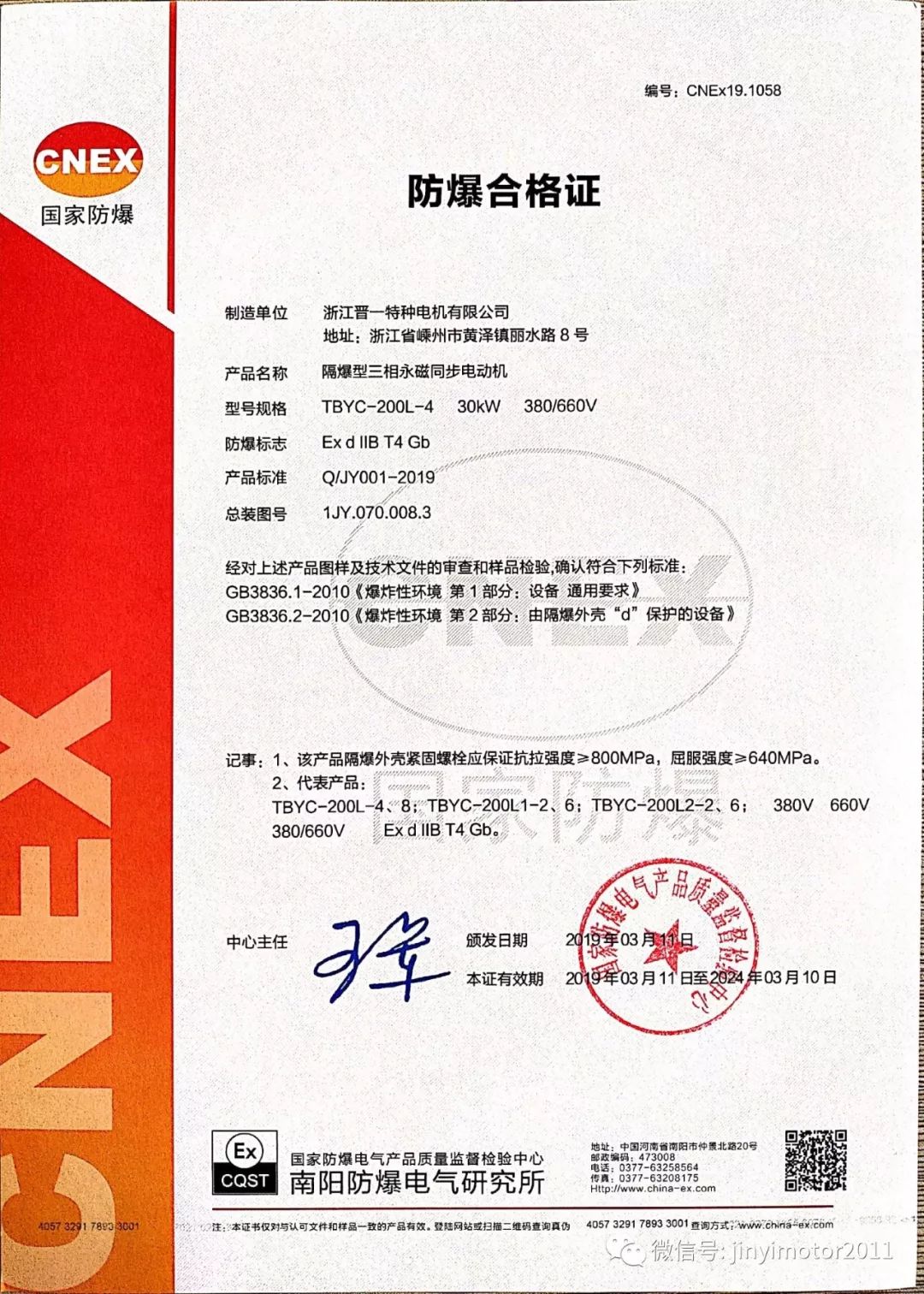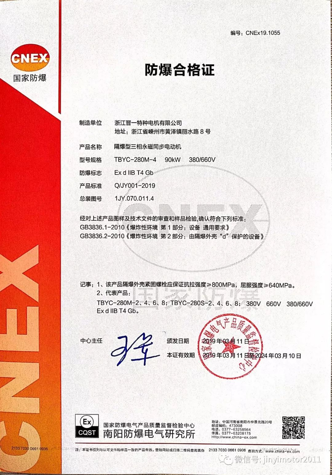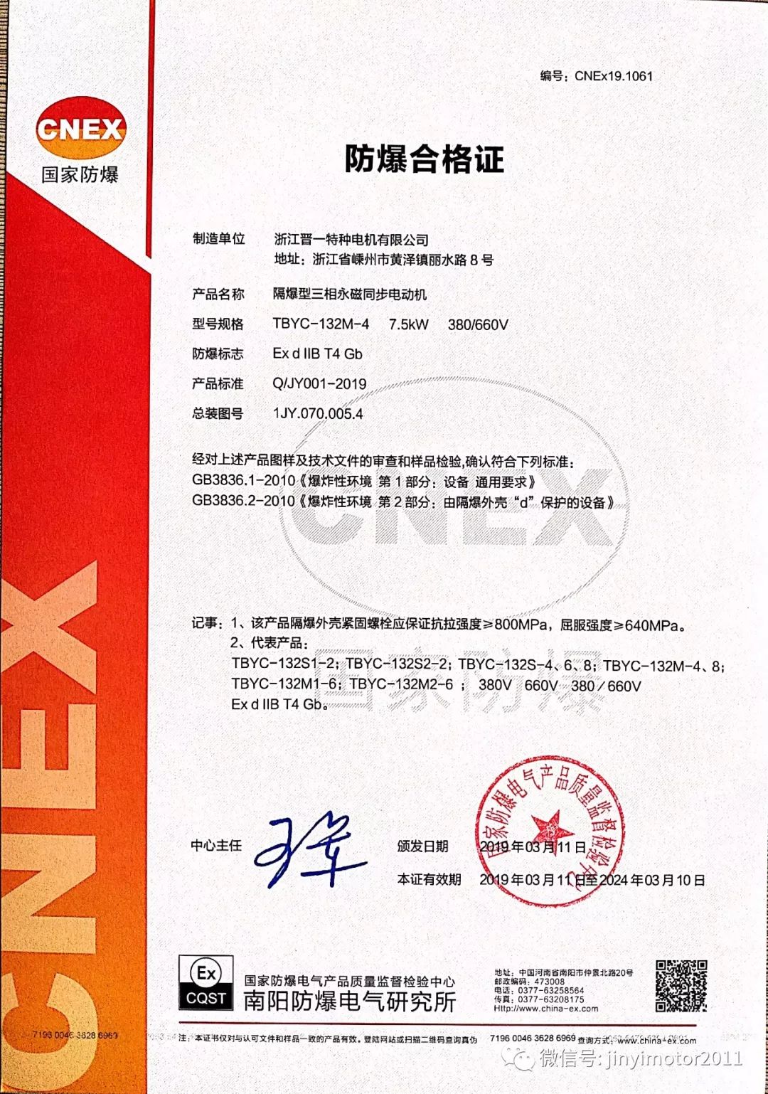 晉一隔爆型三相永磁同步電動(dòng)機(jī),獲得南陽(yáng)防爆電氣研究所頒發(fā)的《防爆合格證》