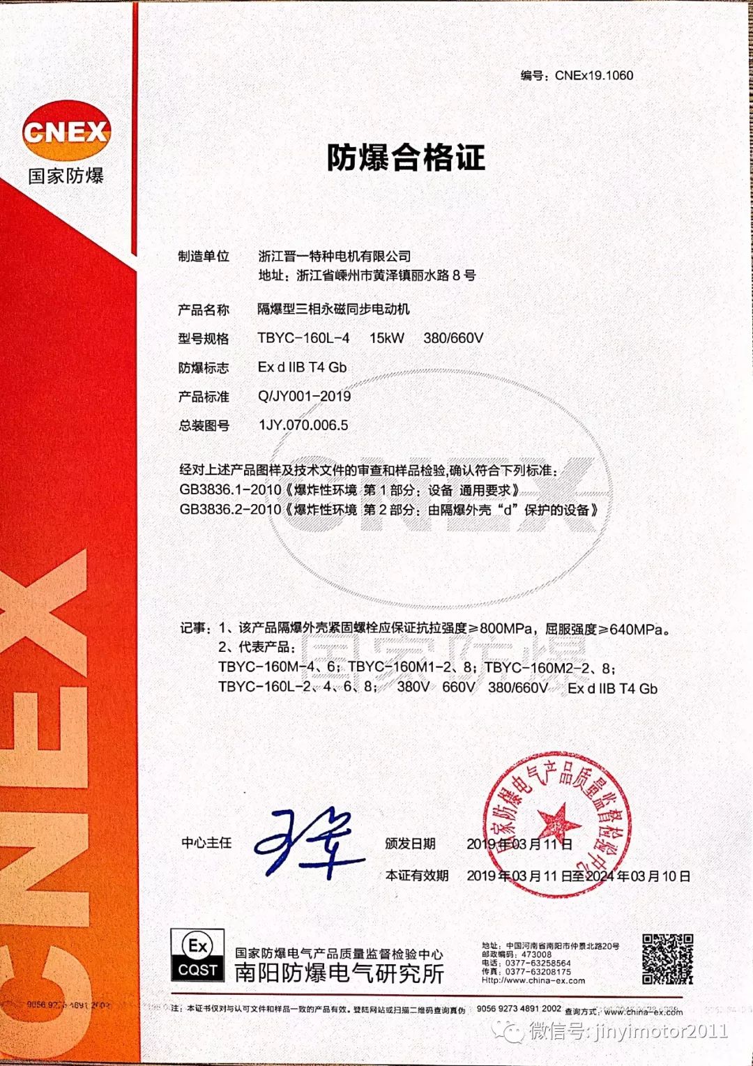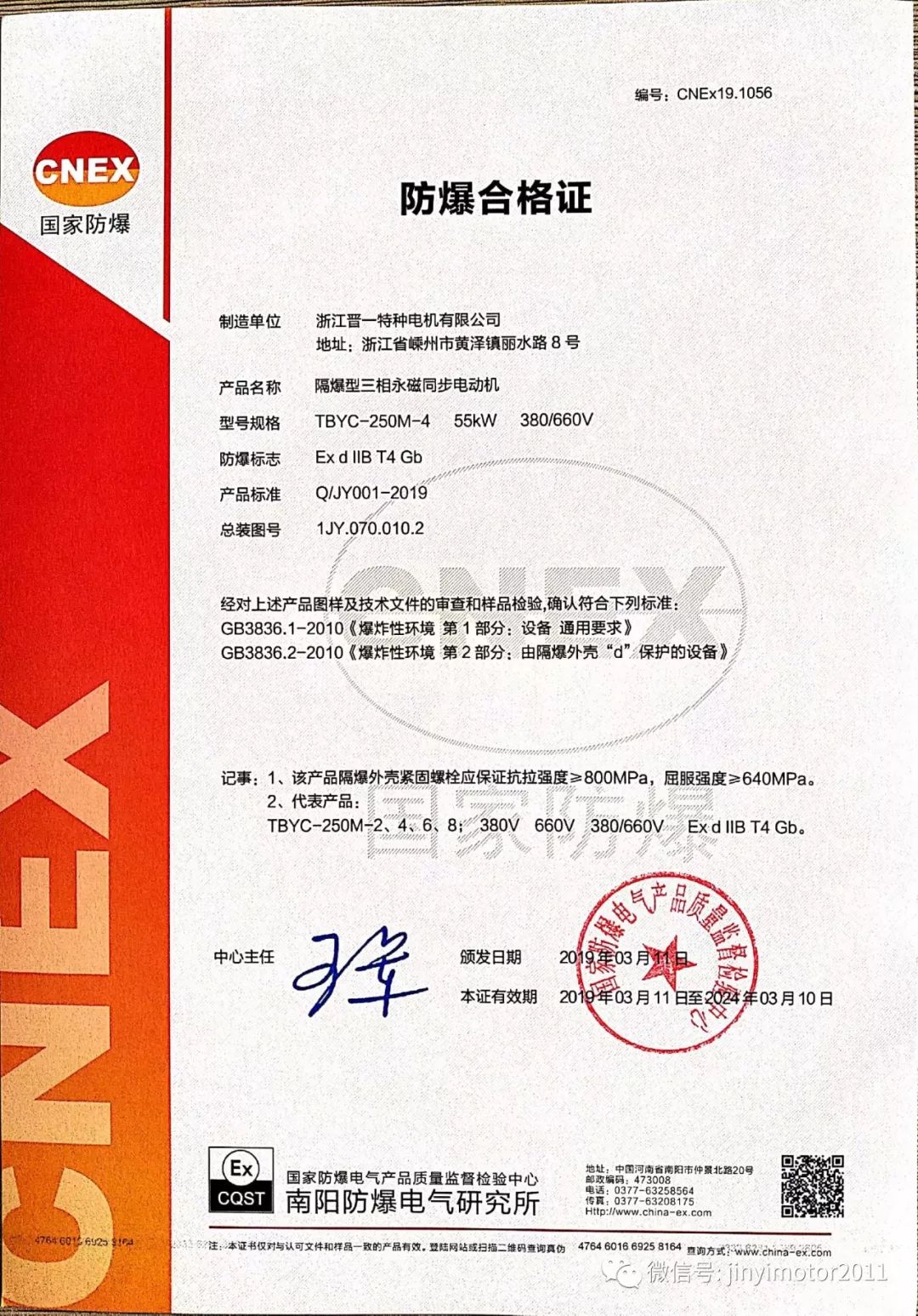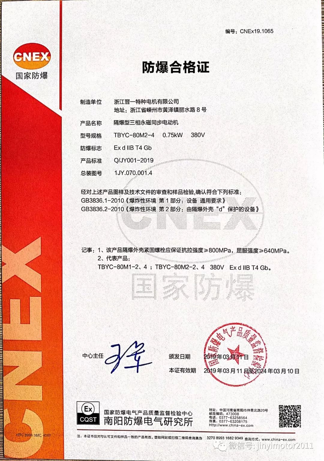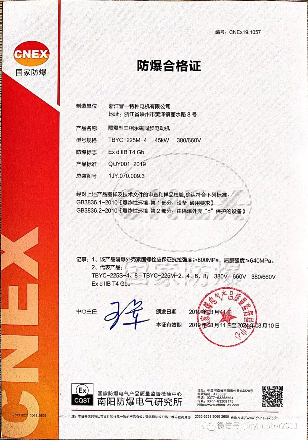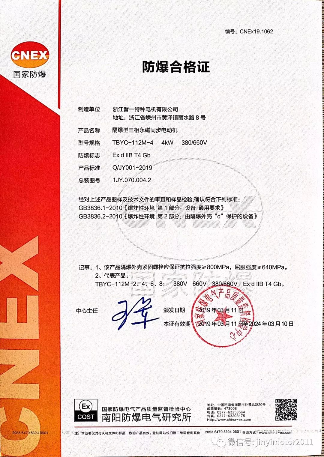 晉一隔爆型三相永磁同步電動(dòng)機(jī),獲得南陽(yáng)防爆電氣研究所頒發(fā)的《防爆合格證》