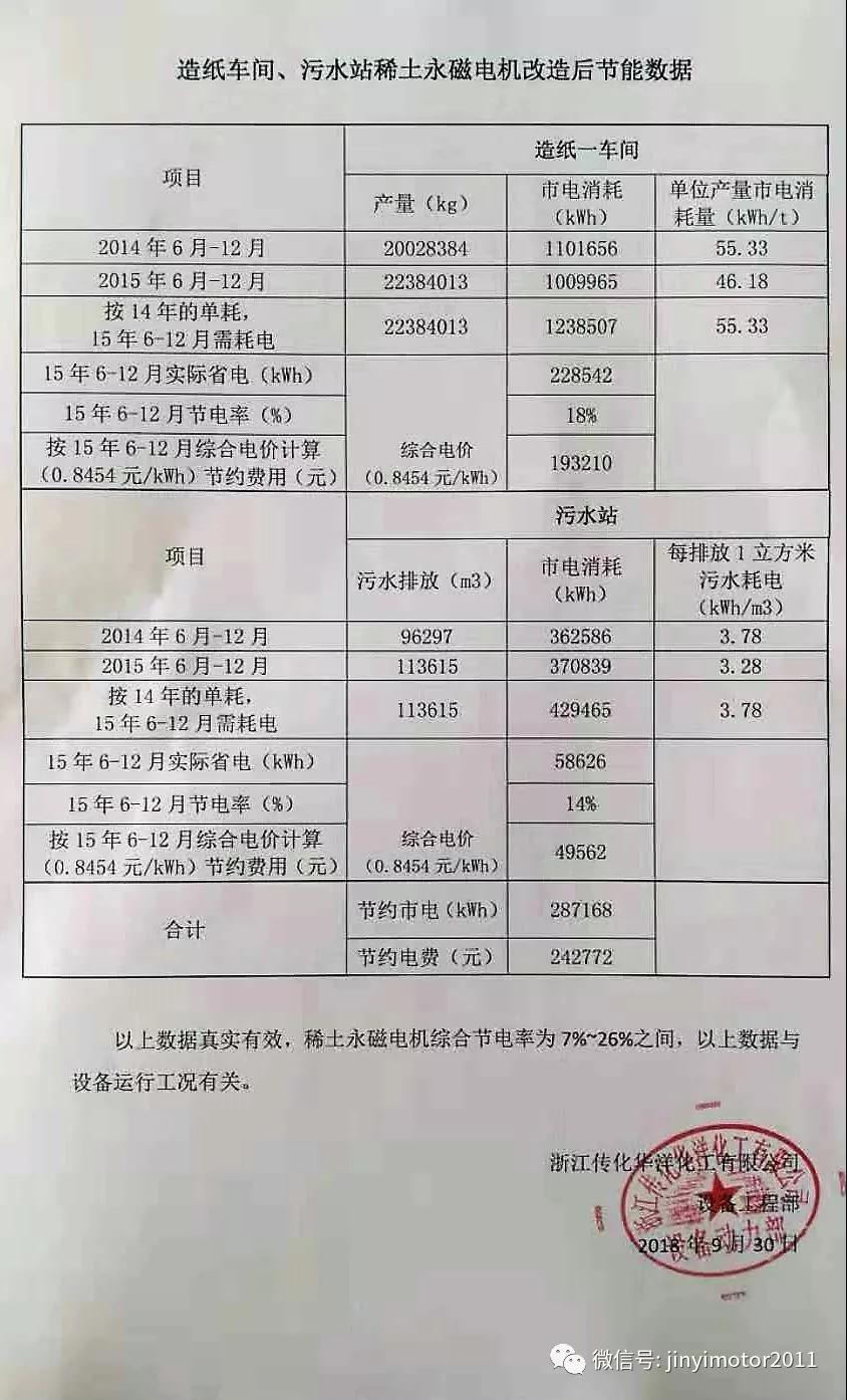 據(jù)悉,浙江晉一特種電機是2015年2月份開始對浙江傳化華洋化工有限公司所使用的電機進行節(jié)能改造。該數(shù)據(jù)自2015年6月份開始進行跟蹤統(tǒng)計,至2015年12月份止:造紙一車間節(jié)能電機的節(jié)電率為18%,7個月累計節(jié)約電費19.321萬元;污水站節(jié)能電機的節(jié)電率為14%,7個月累計節(jié)約電費4.9562萬元。兩個車間累計節(jié)約電費24.2772萬元。