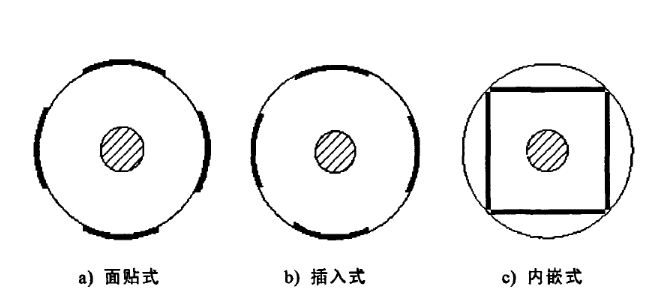 永磁同步電機(jī)首要是由轉(zhuǎn)子、端蓋、及定子等各部件組成的。一般來說,此電機(jī)的 的特點(diǎn)是它的定子結(jié)構(gòu)與普通的感應(yīng)電機(jī)的結(jié)構(gòu)十分的類似,首要是區(qū)別于轉(zhuǎn)子的共同的結(jié)構(gòu)與其它電機(jī)構(gòu)成了不同。和常用的異步電機(jī)的 不同則是轉(zhuǎn)子的共同的結(jié)構(gòu),在轉(zhuǎn)子上放有高質(zhì)量的永磁體磁極。由于在轉(zhuǎn)子上安放永磁體的方位有許多挑選,所以此電機(jī)一般會(huì)被分為三大類:內(nèi)嵌式、面貼式以及插入式,如下圖所示。此電機(jī)的運(yùn)轉(zhuǎn)功能是 受重視的,影響其功能的要素有許多,可是 首要的則是永磁同步電機(jī)的結(jié)構(gòu)。就面貼式、插入式和嵌入式而言,各種結(jié)構(gòu)都有各自的優(yōu)勢。