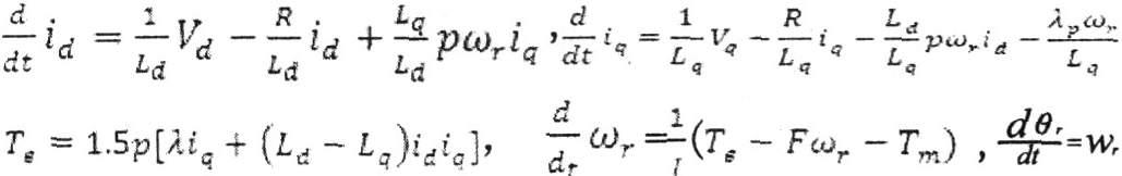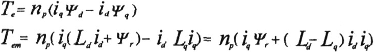 永磁同步電動機是交流同步調(diào)速系統(tǒng)的首要環(huán)節(jié),分析其數(shù)學模型對把握其調(diào)速特性尤為重要。取轉(zhuǎn)子永磁體基波勵磁磁場軸線為d軸,q軸順著旋轉(zhuǎn)方向超前d軸90度電視點,dq軸系伴隨轉(zhuǎn)子以角速度ωr一道旋轉(zhuǎn),它的空間坐標以d軸與參閱軸α間的電視點θr來表明,則理想永磁同步在dq旋轉(zhuǎn)坐標系中的數(shù)學模型能夠?qū)懗扇缦滦问剑?/p>