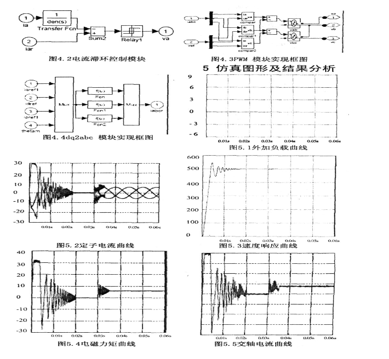 圖4.1三相永磁同步電機矢量控制仿真框圖依據(jù)轉(zhuǎn)子磁場定向的三相PMSM矢量控制系統(tǒng)仿真框圖如圖4.1所示。圖中PI模塊為速度環(huán)PI控制器,依據(jù)電機實踐速度及給定速度來斷定電流轉(zhuǎn)矩重量;PWM模塊選用電流滯環(huán)控制(如圖4.2),使電機實踐電流跟從給定電流改變,詳細完成如圖4.3;模塊dq2abc完成2r/3s改換,詳細完成如圖4.4,其間函數(shù)模塊Fcn、Fcnl和Fcn2一同完成2r/3s改換;MMD模塊為電機丈量模塊,它實時測量電機的速度、電流、轉(zhuǎn)子方位等信號:PMSM模塊為MATLAB提供了永磁同步電機模型,它的具體實現(xiàn)如圖2.1。