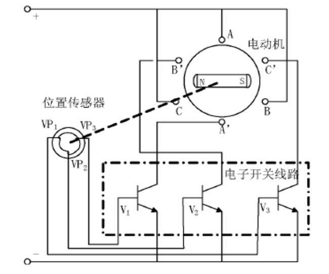 圖中的電動機(jī)本體為三相南北極,三相定子繞組分離與電子開關(guān)線路中對應(yīng)的功率開關(guān)器材聯(lián)合,A相、B相、C相繞組分離,并且與功率開關(guān)管1V,2V,3V進(jìn)行銜接,方位傳感器1VP、2VP、3VP的盯梢轉(zhuǎn)子與電機(jī)轉(zhuǎn)軸相聯(lián)合,用來檢測電動機(jī)轉(zhuǎn)子的方位,其輸出端與電子開關(guān)線路中對應(yīng)的功率開關(guān)器材銜接。